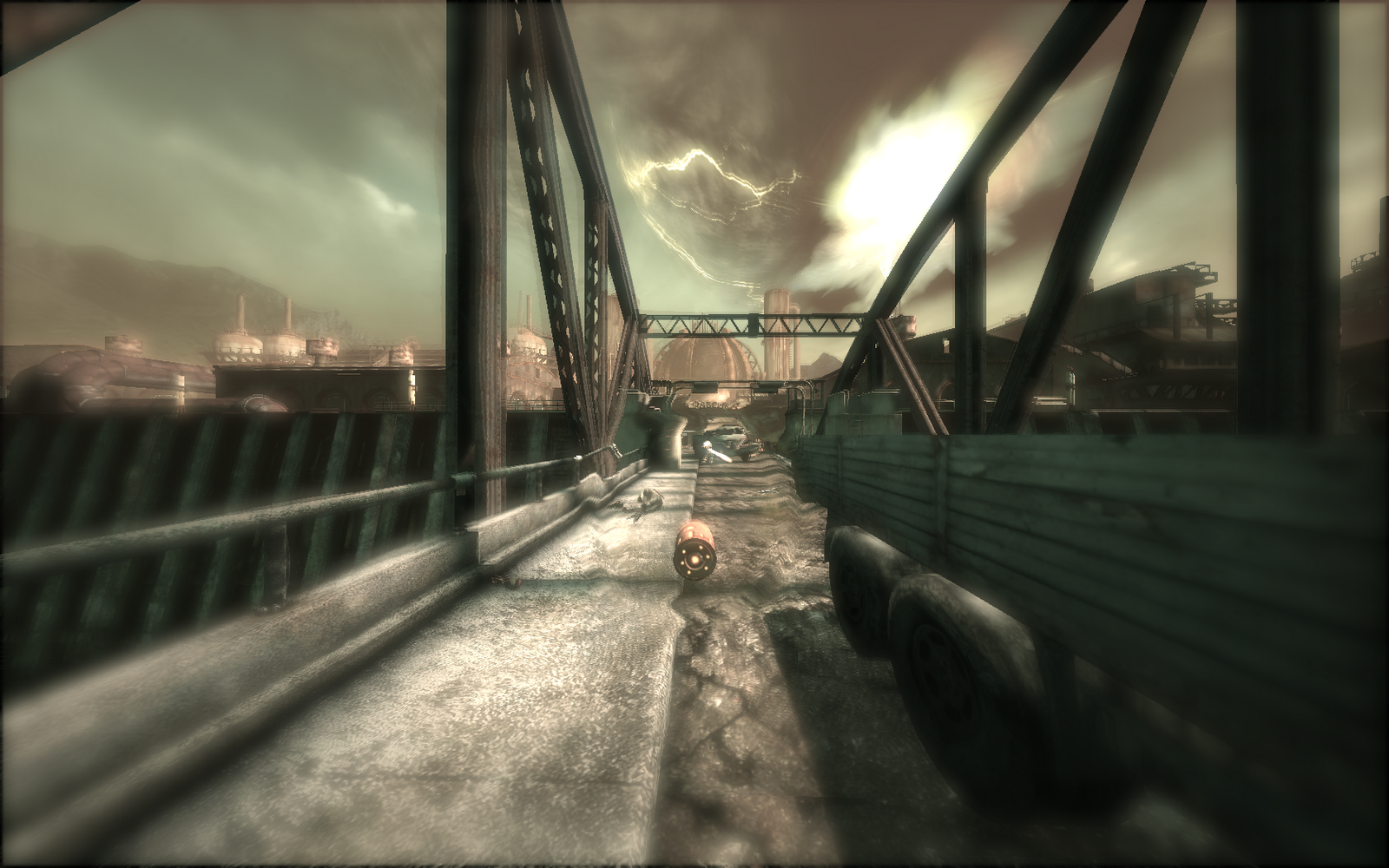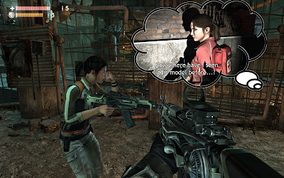 Device," or TMD, that mirror plasmids from Bioshock, such as the ability to catch airborn projectiles and hurl them back at enemies. There's also the fact that everything around you is rusting, falling apart and awash in 50's paraphenalia, but that felt a little more to me like Fallout 3 than Bioshock, slim differentiation though that may be. The game also borrows the "aiming down the barrel turns anything into a sniper rifle" dynamic from Call of Duty, as well as the grenade danger indicator and the ability to only carry two weapons. There's also a heated spike launcher that feels suspiciously like the Half Life 2 crossbow (not to mention you also get a gravity gun power later), a boss fight right out Borderlands, a "sidekick" NPC that looks suspiciously like a certain L4D survivor, the "listening to audio logs that fill in the backstory" dynamic that just about every game has used since Doom 3, quickdraw/shoot sequences like in Call of Juarez, and a weapon called the "Seeker" which fires bullets you remote control in slow motion that brings back memories of the drones you use in Frontlines - Fuels of War. There's even a little bit of "companion cube" type puzzling a-la Portal.